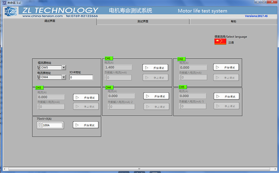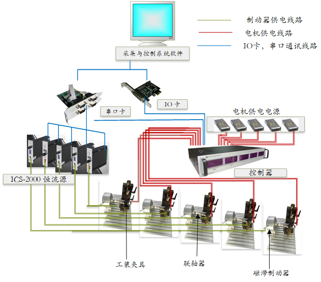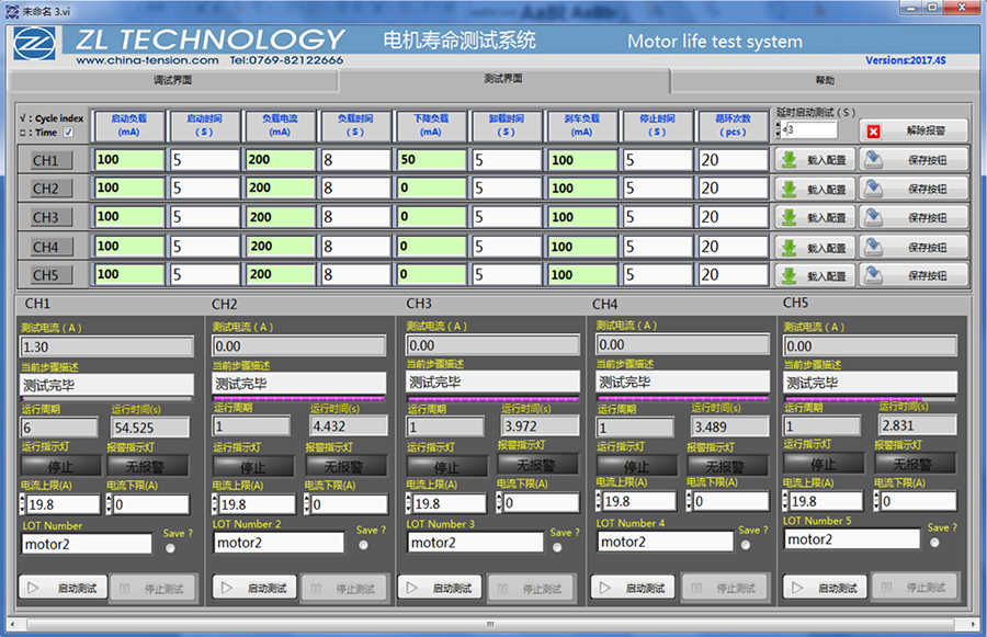 五工位电机寿命测试系统是电机模拟负载耐久测试的专用设备。该系统由磁滞制动器;恒流源;工装夹具;工控机;联轴器;控制器;测试台;测试软件等组成。系统测试软件运行于Windows7或以上环境,具有功能全面、可靠性好、操作方便、拓展性强等特点。能快速,精准的检测测试电机的电流,温度等参数,并且能将测试数据储存在本地磁盘。有五个独立的通道,能单独控制电机的启停与加载,并五通道之间互不干涉与影响.